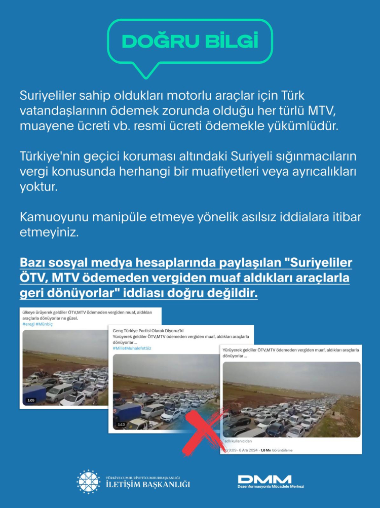 Dezenformasyonla Mücadele Merkezi'nden yapılan açıklamada," Suriyeliler sahip oldukları motorlu araçlar için Türk vatandaşlarının ödemek zorunda olduğu ÖTV, MTV, muayene ücreti vb. resmî ücreti ödemekle yükümlüdür. Türkiye'nin geçici koruması altındaki Suriyeli sığınmacıların vergi konusunda herhangi bir muafiyetleri veya ayrıcalıkları yoktur. Kamuoyunu manipüle etmeye yönelik asılsız iddialara itibar etmeyiniz" ifadeleri yer aldı.