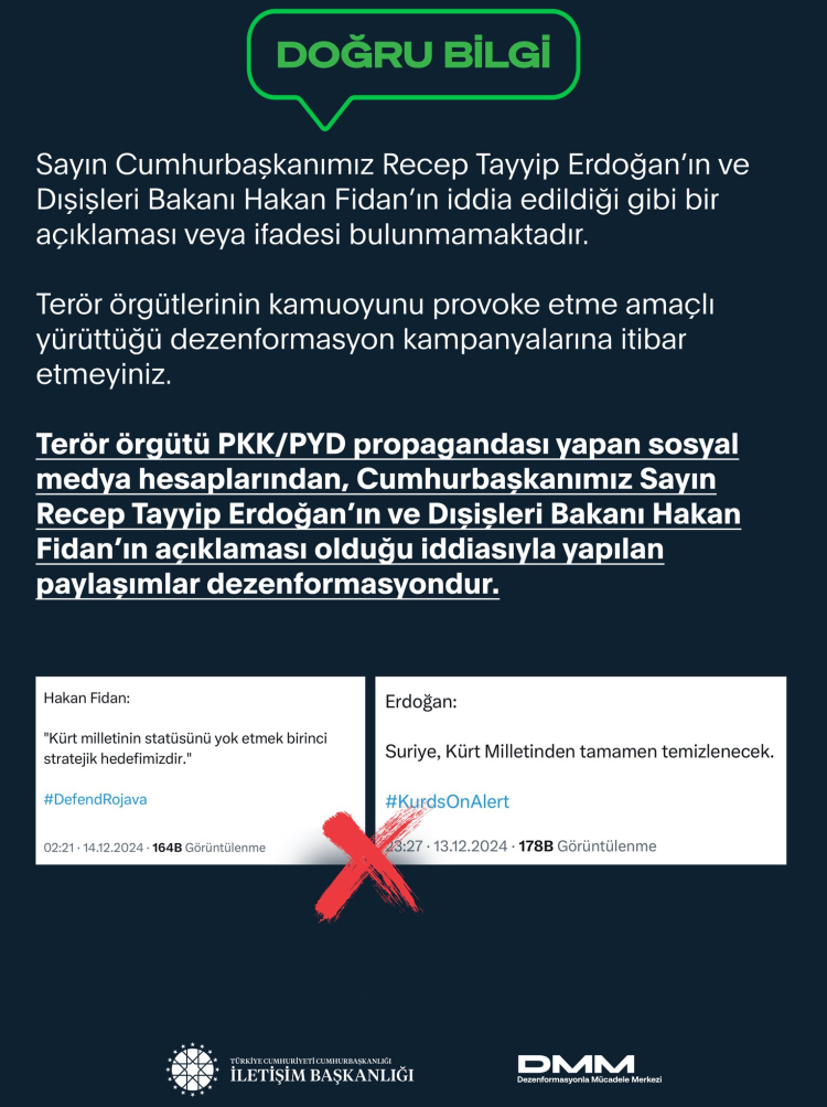Terör örgütü PKK/PYD propagandası yapan sosyal medya hesaplarından, Cumhurbaşkanı Recep Tayyip Erdoğan'ın ve Dışişleri Bakanı Hakan Fidan'ın açıklaması olduğu iddiasıyla yapılan paylaşımların dezenformasyon olduğu açıklandı.