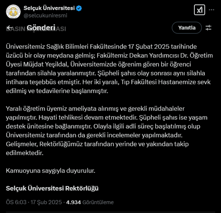 Konya Selçuk Üniversitesi Sağlık Bilimleri Fakültesi'nde yaşanan öğrenci ile Dekan Yardımcısı arasındaki silahlı yaralama ile ilgili resmi açıklama Selçuk Üniversitesi Rektörlüğü'nden geldi. Rektörlükten yapılan yazılı açıklamada, yaralı öğretim üyesinin ameliyata alınarak, gerekli müdahalelerin yapıldığı ve hayati tehlikesinin devam ettiği bildirildi.