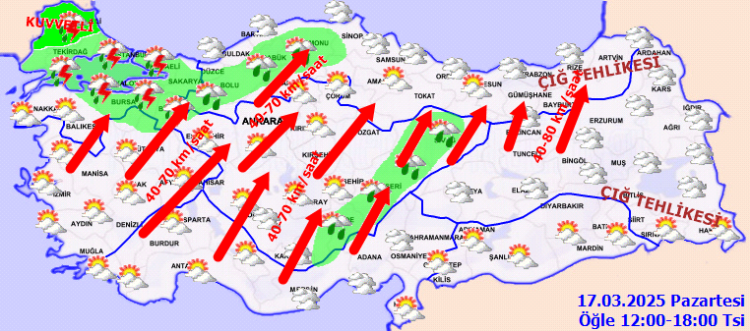 Yağışların; Edirne ve Kırklareli çevrelerinde yerel kuvvetli olması bekleniyor. Rüzgarın; Ege, Batı Akdeniz ve Orta Karadeniz iç kesimleri, Doğu Karadeniz, Doğu Anadolunun batısı ile İç Anadolu ve Marmara'nın güneyinde güneyli yönlerden kuvvetli olarak (40-70 km/saat) esmesi bekleniyor.