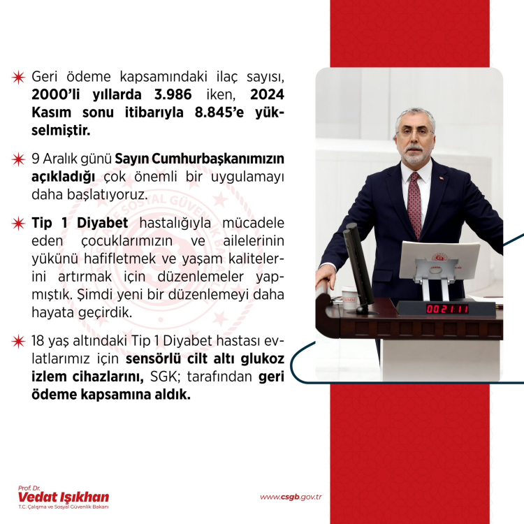 18 yaş altındaki Tip 1 Diyabet hastaları için sensörlü cilt altı glukoz izlem cihazlarını SGK; tarafından geri ödeme kapsamına alındı. 2024 Kasım sonu itibarıyla geri ödeme kapsamındaki ilaç sayısı 8 bin 845’e yükseldi.