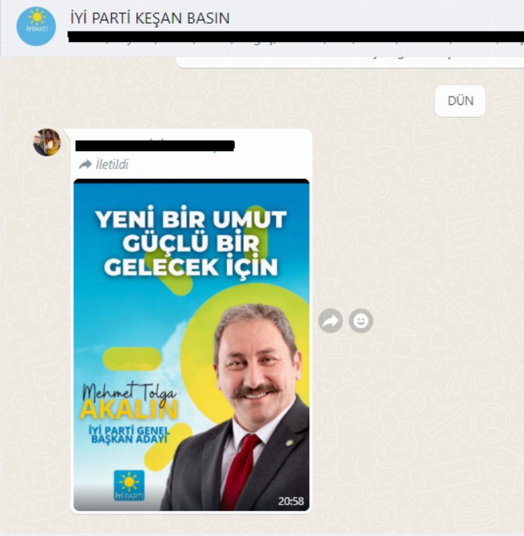İYİ Parti Keşan İlçe Başkanlığı’nın eski whatsap Keşan basın grubunda Mehmet Tolga Akalın’ın İYİ Parti Genel Başkan Adayı afişi paylaşıldı