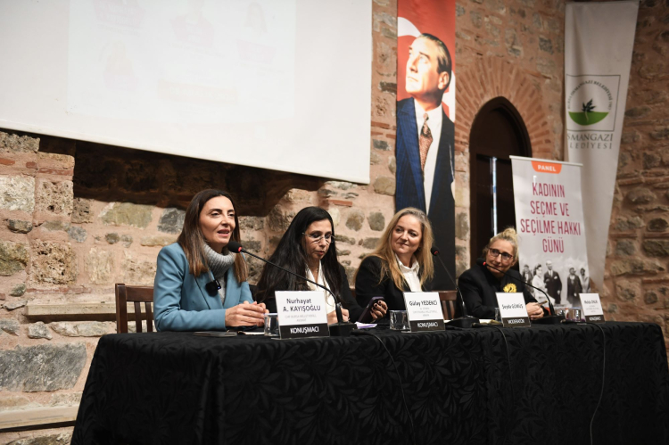 BURSA (İGFA) - Panelde gazeteci Şeyda Gümüş moderatörlüğünde Ördekli Kültür Merkezi’nde düzenlenen “Kadının Seçme ve Seçilme Hakkı” panelinde CHP Bursa Milletvekili NurhayatAltaca Kayışoğlu, CHP 25 ve 26. Dönem İstanbul Milletvekili Gülay Yedekçi ve CHP 24. Dönem İstanbul Milletvekili Melda Okur, konuşmacı olarak katılarak kadının toplumda, yaşamda ve siyasetteki yerine değinerek haklarını konuştu. Kadınlara seçme ve seçilme hakkının verilişinin 90’ıncı yıl dönümünde düzenlenen panele Osmangazi Belediye Başkanı Erkan Aydın, Bursa Büyükşehir Belediye Başkan Vekili Sinan Nergiz, Osmangazi Belediye Başkan Yardımcısı Mutlu Esendemir ve Osmangazili kadınlar katıldı.
